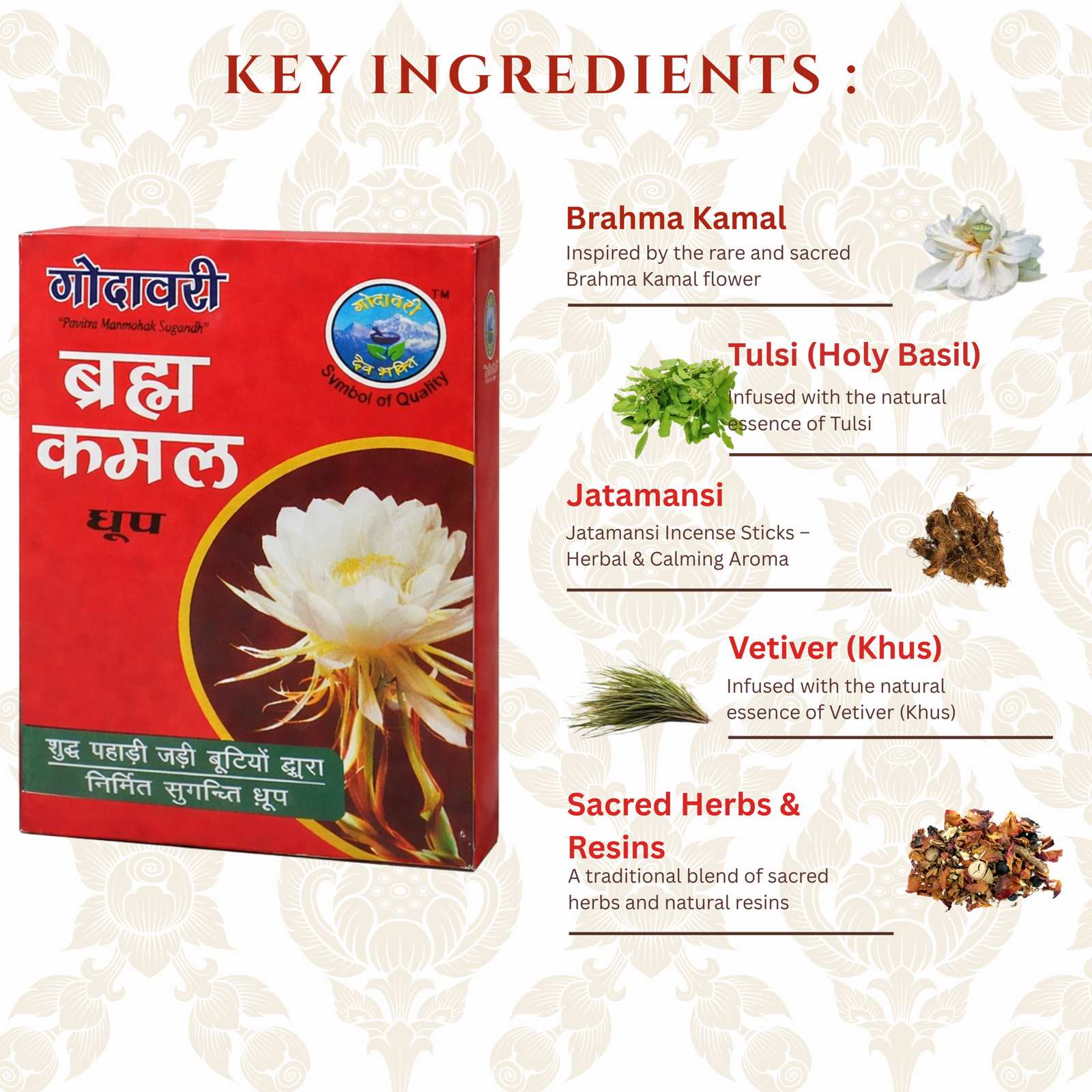 Brahmakamal Dhoop is inspired by the rare and sacred Himalayan flower, revered for its deep spiritual and divine significance. Its rich, soothing fragrance gently purifies the surroundings and creates an atmosphere filled with peace, devotion, and positivity.