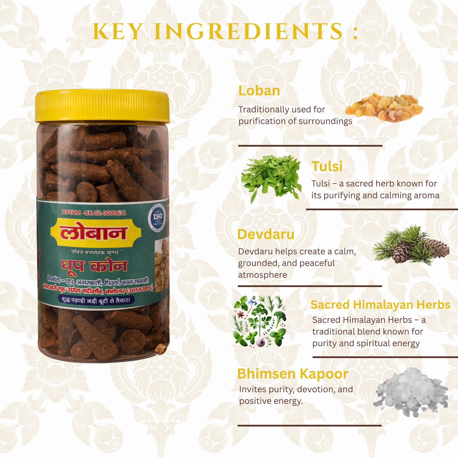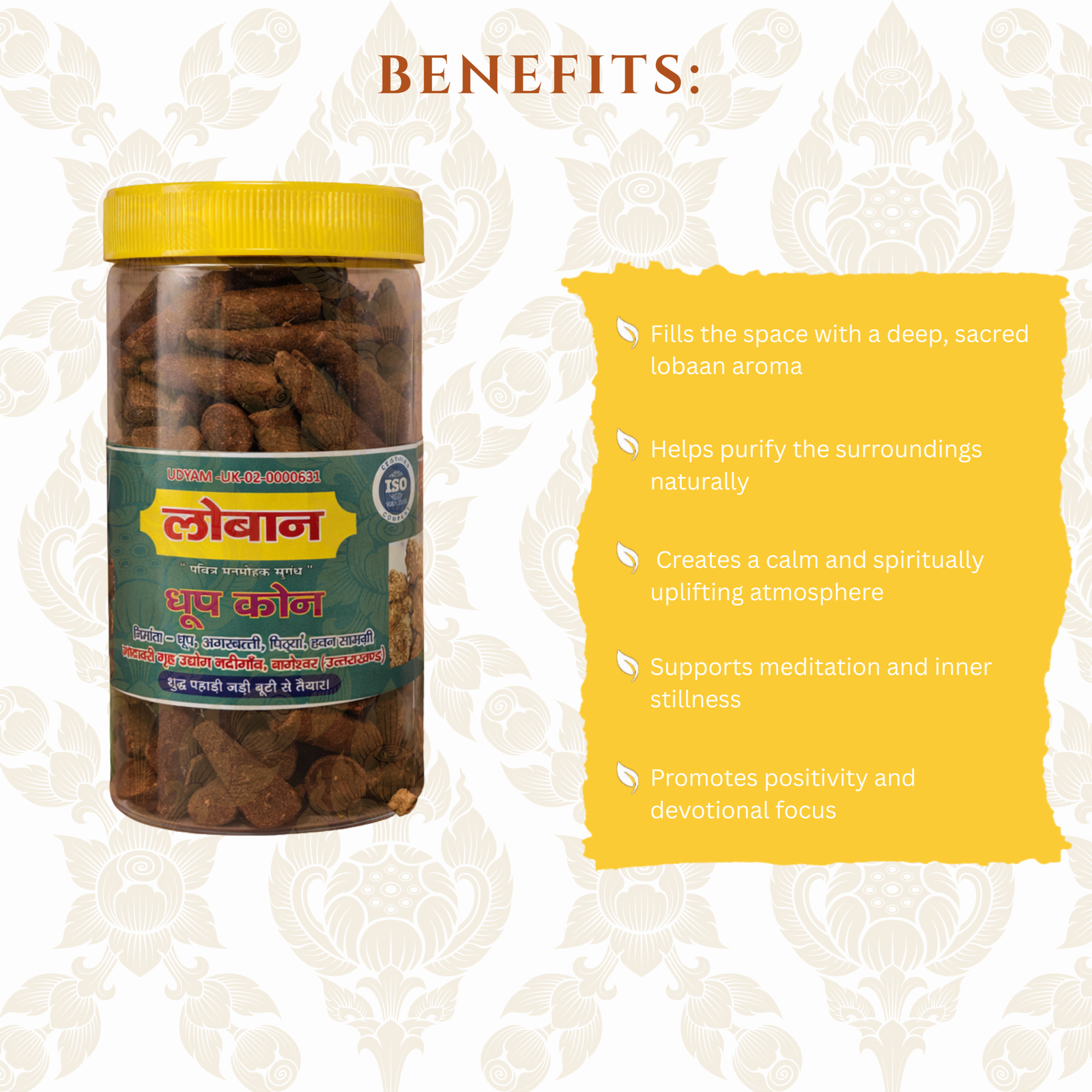 With its deep, temple-style fragrance, Looban Dhoop Cones are ideal for daily pooja, aarti, meditation, and spiritual practices. The smooth-burning, low-smoke formulation ensures a clean and long-lasting aromatic experience, making them suitable for both home and temple use.